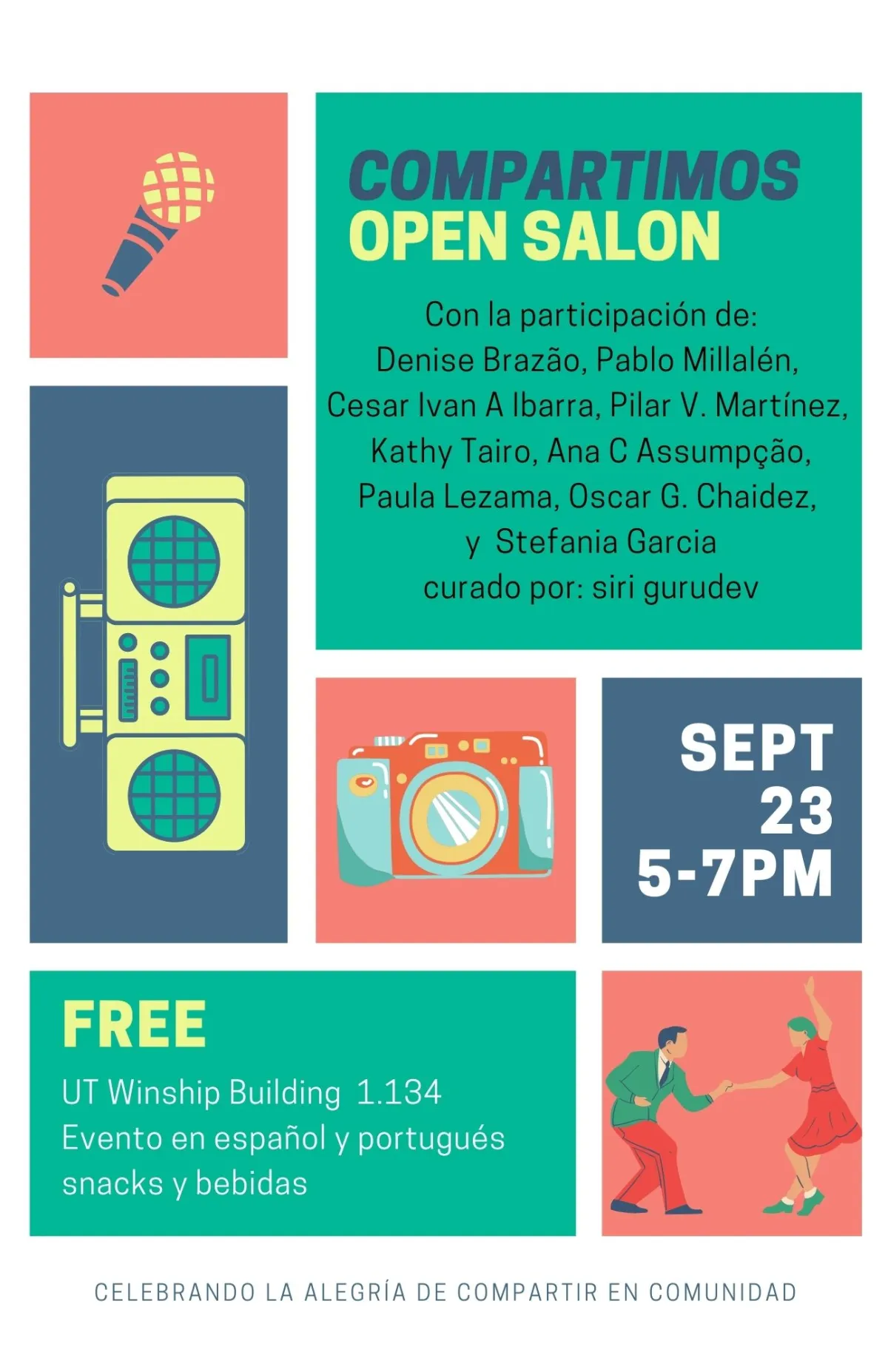 Curated by siri gurudev, Ph.D. candidate from the Performance as Public Practice area, Compartimos Open Salon features nine participants that have been invited to share something (a song, a movement, their own or someone else's poems, a story, a reflection, photos, images) for nine minutes or less. Sharing could include rap, poetry and even dancing! Performers include students from Teresa Lozano Long Institute of Latin American Studies, the Department of Mexican and Latina/o Studies, the Department of Spanish and Portuguese and the Program in Comparative Literature, among others.