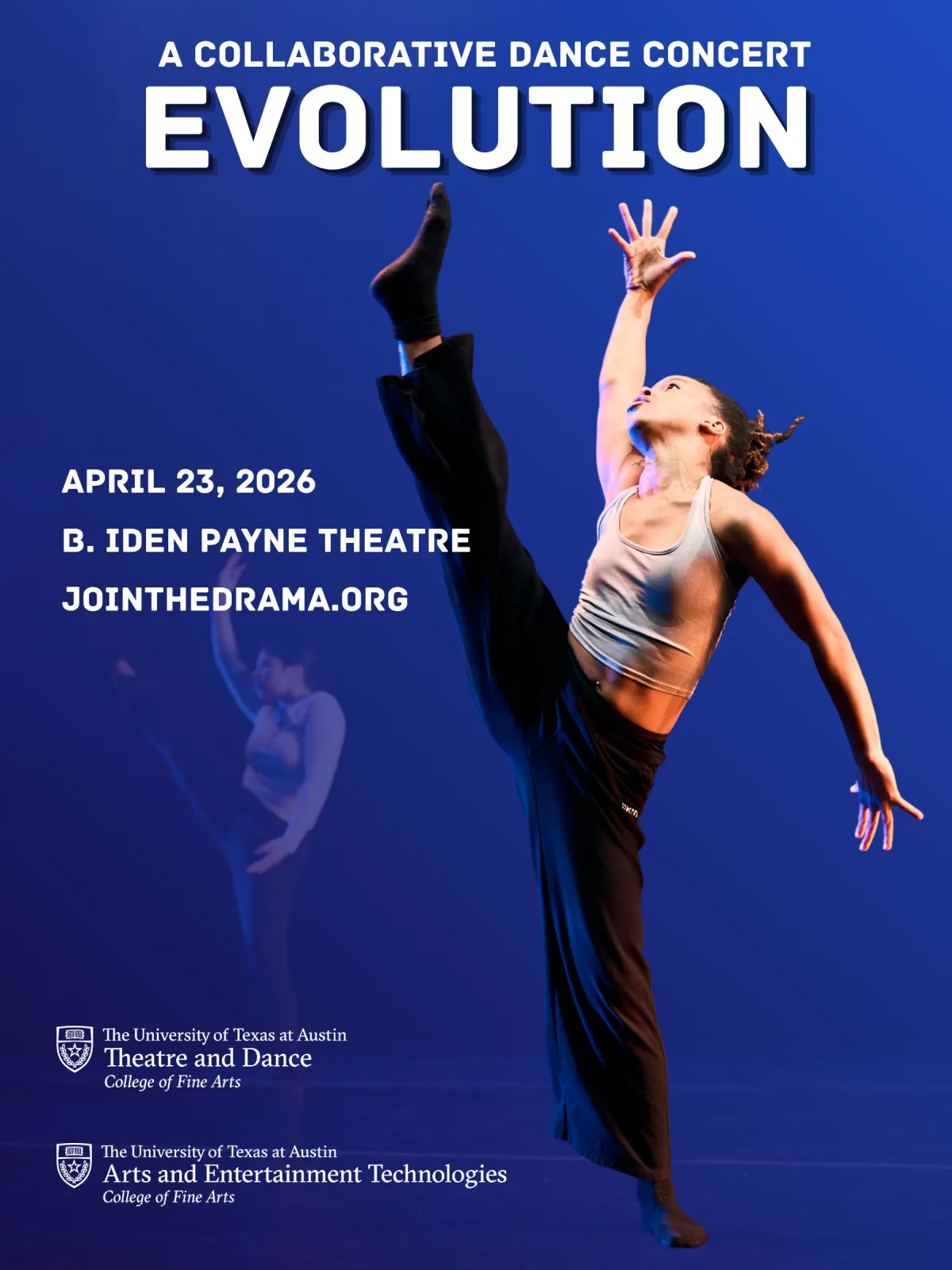 Evolution showcases cutting-edge design and dance performance, serving as the culmination of a semester-long interdisciplinary collaboration. Choreographers from the Department of Theatre and Dance join with composers from the Department of Arts and Entertainment Technologies to create short dance works and soundscapes. New this year, Evolution will include original dance films in addition to pieces choreographed and designed for the stage. This public showcase is presented in the B. Iden Payne Theatre each spring.